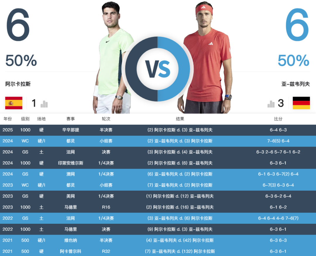 回看两人过往的交锋史,双方各胜六场看似旗鼓相当,但这似乎也包含了不小的迷惑性。因为在西班牙人火力最为凶猛的2025赛季,两个人仅在辛辛那提大师赛半决赛有过一次交锋,那场比赛面对已经升级到2.0版本的阿尔卡拉斯,兹维列夫谈不上有太多机会。6-4 6-3的比分也只是数据上的体面。回溯过往一个赛季,两人同为Top5级别球员,交手次数却如此有限,一个重要原因还是在于兹维列夫的表现并不尽如人意。